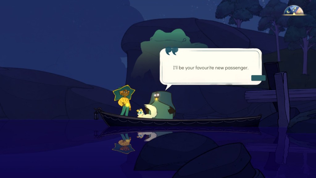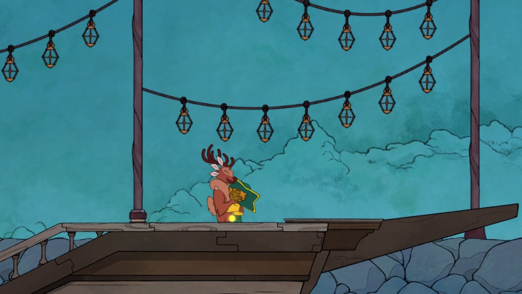 Alternatively, look at how the game, well, looks. Spiritfarer’s animation and art style are simply gorgeous to look at. The animation, in particular, deserves mention as the game uses lots of frames, meaning that every animation -every movement, idle animation and conversation- looks incredible. Aiding these animations are Spiritfarer‘s character designs, all of which are unbelievably charming. From Gwen, a reindeer who looks like she’s wearing a mink coat, to Atul, a delightfully rotund frog, the way that the spirits who inhabit your boat look are probably one of the best parts of the game, showcasing both the imagination of the developers, but also the personalities of the characters. I loved Stella’s design in particular; an incredibly sweet depiction of a young girl that seemed reminiscent of the work of artist Molly Ostertag or the titular character from the animated show Kipo and the Age of Wonderbeasts.