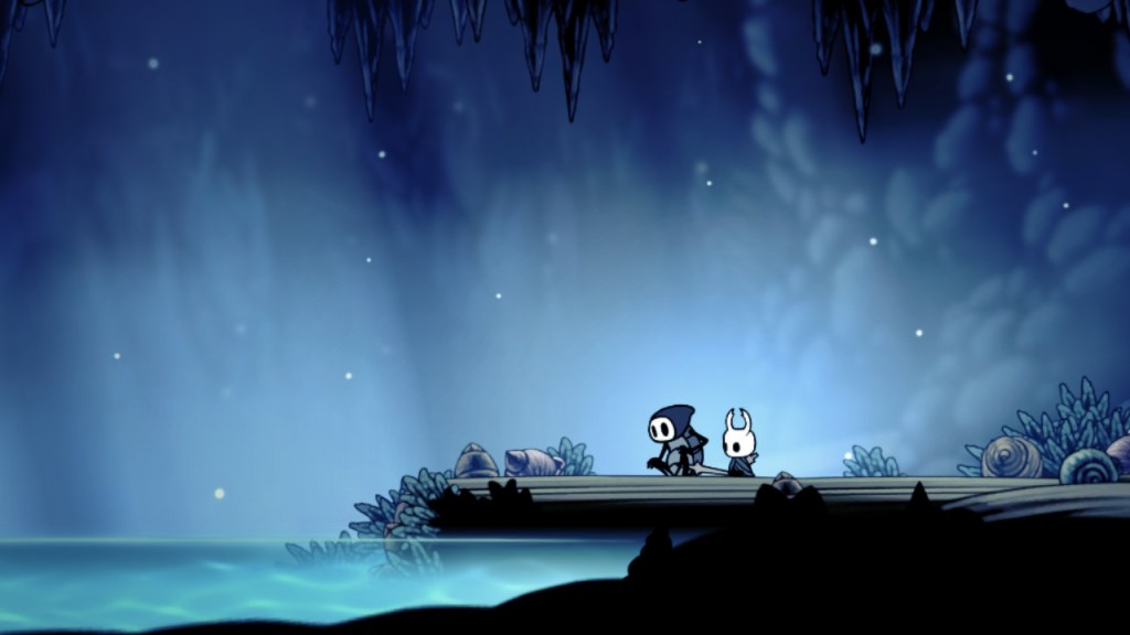 Hallownest is comprised of a dozen different areas, from the overgrown Greenpath to the mines of the Crystal Peak and the oppressive darkness and horrific monsters of Deepnest. Each of these areas feels unique and memorable, either through how the levels are laid out, or the unique enemies or challenges that they introduce. But despite how well crafted these areas are, none of them are my favourite area of the game. No, my favourite area is one that is relatively small. It doesn’t contain many enemies; the ones that do appear also inhabit several of the game’s other locales. The area doesn’t have a unique gimmick either. No, it’s just a large room, filled with a big lake. But the area in question, the Blue Lake, is my favourite area in the entire game, mostly because it is linked to my favourite character; the explorer Quirrel.