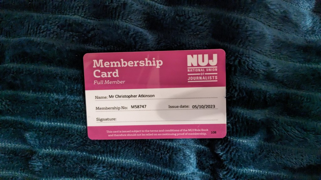 This small card is evidence of my membership in the NUJ – the National Union of Journalists. Membership offers me a lot of benefits; legal support, contacts, and training. But I think the most notable benefit is collective bargaining. The union can help to negotiate pay rates and time off, making a fair workplace. Members can go on strike and shut down production. I am proud to be a union member.