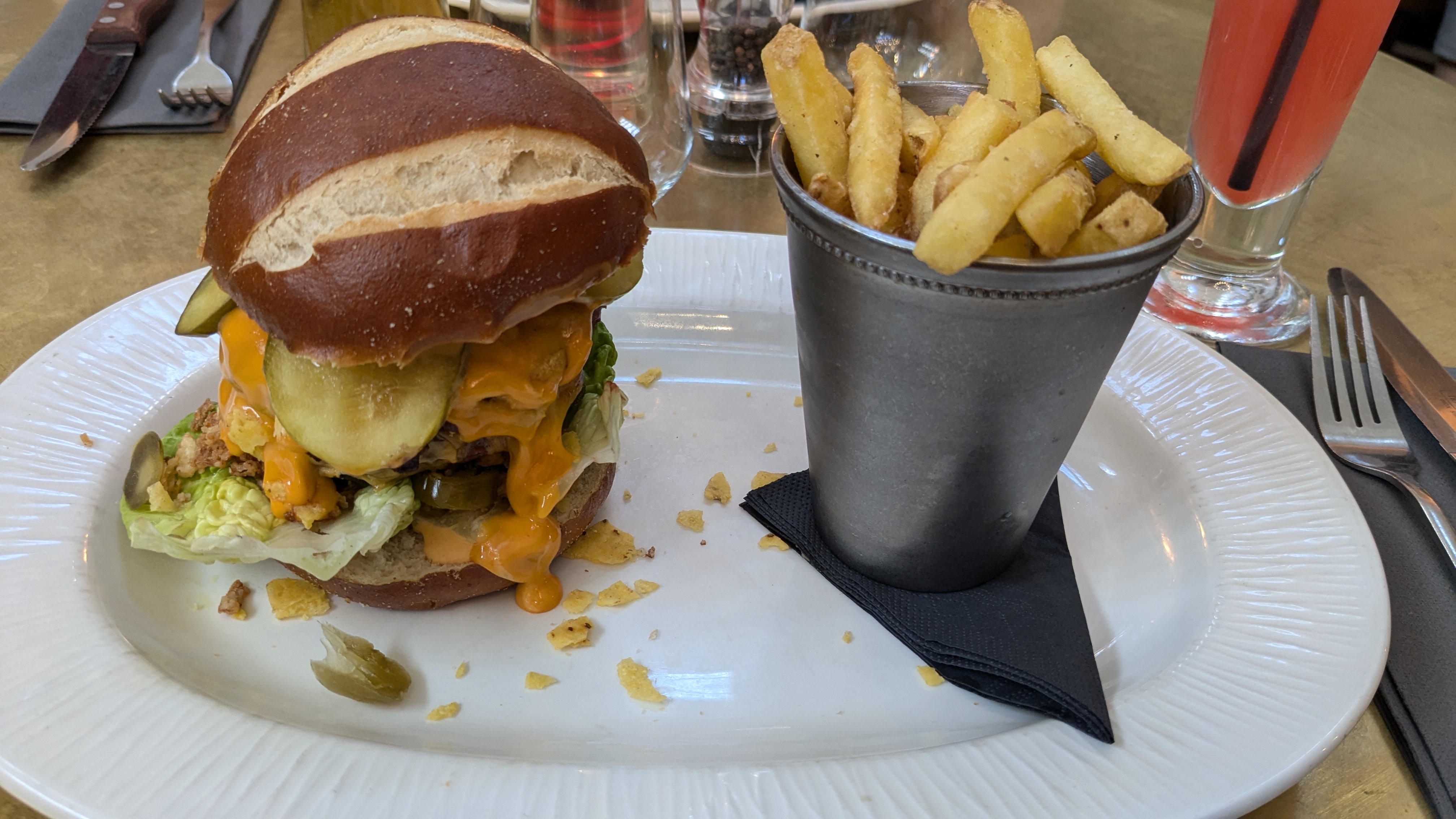 After that we walked into Leicester for dinner, eventually deciding on a restaurant called Middleton’s Steak and Grill – which presumably has no connection to the royal family. I ended up having an almost disgustingly tall “Mexican” burger, which came with cheese sauce, nachos and jalapenos, and an incredibly sweet mocktail which will probably cause my dentist to have some sort of fit when I tell him about it.