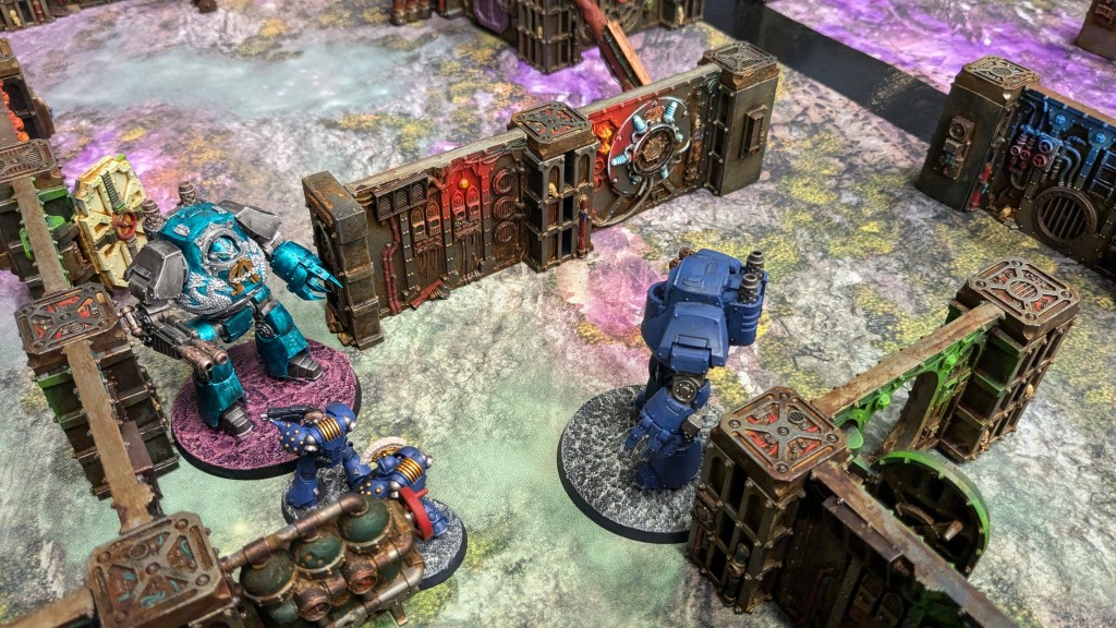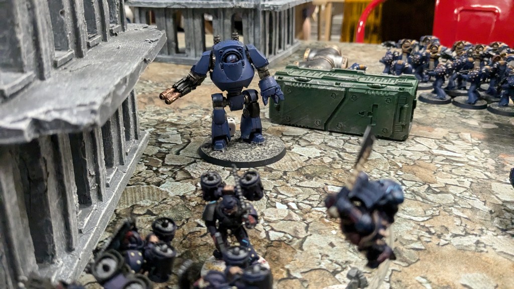 Because of this, I started mixing things up a bit with the Logos, starting with Full March and then transitioning into Retribution Strike instead of Hold Fast, charging my Praetor and his bodyguards into a despoiler squad to wipe them out completely. I ended up deep striking my storm squad (something which I forgot I couldn’t do) to wipe out a rear line centurion and accompanying rapier battery, with my terminators and a tactical squad holding one of the middle objectives. A Night Lord inductii squad was able to pin my Praetor for a turn, and do a surprising amount of damage, but support for my forces came from a Warhound Titan piloted by Josh (who would go on to win best loyalist for his amazing Ultramarines force), who threw out a sickening amount of shooting each round. Between us, we were able to destroy the Inductii and prevent a deep-striking assault squad from taking a back objective, and I won a very close game with 3 VP to 2.