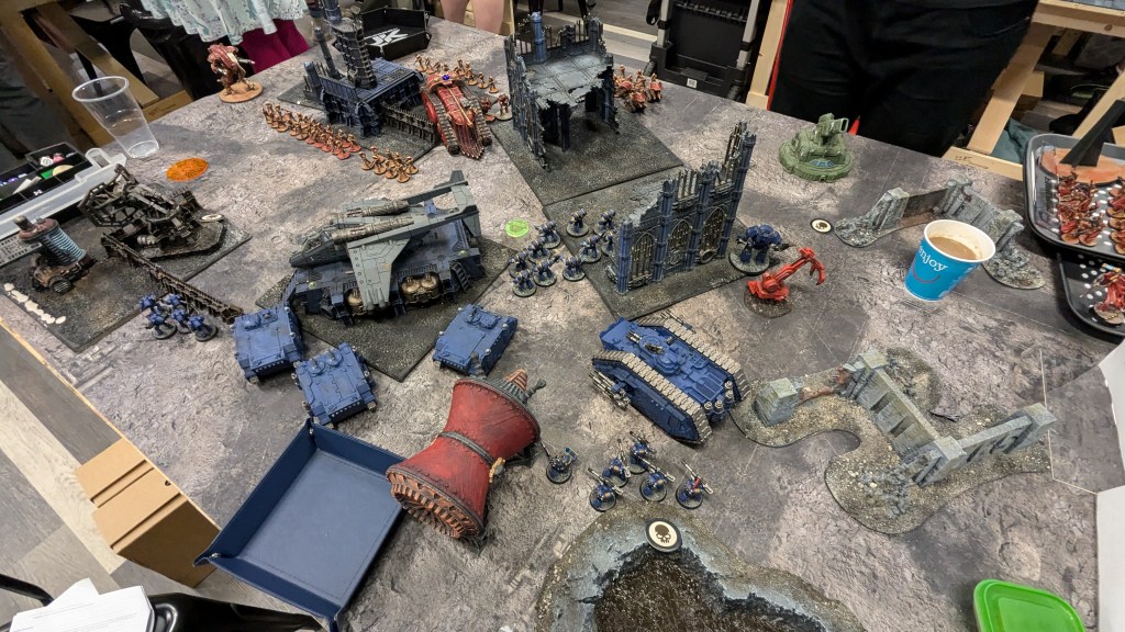 We had a relatively chilled start to the day, with a whole 30-minute(!) lie-in as today’s events would be starting a bit later. After checking out of the hotel, we headed to the venue, where Zach gave us the rundown of the narrative changes for the day’s event. Apparently, a vault of archeotech had been discovered on one of the war fronts, containing Men of Iron which had now been unleashed. This was an interesting development, and the converted models used to represent the mechanical horrors were super cool, but I felt like it would have had more of an impact if I had fought on the battlefront at any point over the weekend or if my actions had any impact on this development. I understand that this is the limitation of having such a big narrative event, and I don’t mean any insult to the organisers who did an awesome job, but it did feel a bit like watching other kids play with the cooler toys while I was stuck with a second-hand bucket and spade.