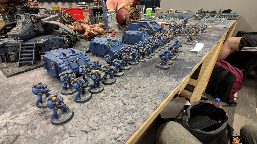 I deployed my army quite aggressively, trying to score the middle objectives and hold the centre of the board for as much as possible. It wasn’t long before my Ultramarines and Mark’s Daemons clashed, with me killing one of his units of chaff in the first turn, and taking out a unit of flamers before they could do much to my line at all. However, it was all for nought, as my opponent’s forces were able to cut through much of my force like butter, with the moment of biggest disgrace coming when he tore through my Praetor and his bodyguard unit in one round of assault with a pair of daemonic sovereigns, causing them to panic and flee and cutting them all down as they ran. Not helping matters was that the first two rounds were played under night fighting rules due to the Night Lords Rite of War affecting all of the tables in the battlezone, meaning my shooting was way less effective than it should have been. I was able to get a late-game orbital bombardment due to the efforts of another Battlegroup which completely destroyed Mark’s flank while leaving my forces unscathed, but it was too little too late, with the game ending with Mark scoring three victory points to my zero.