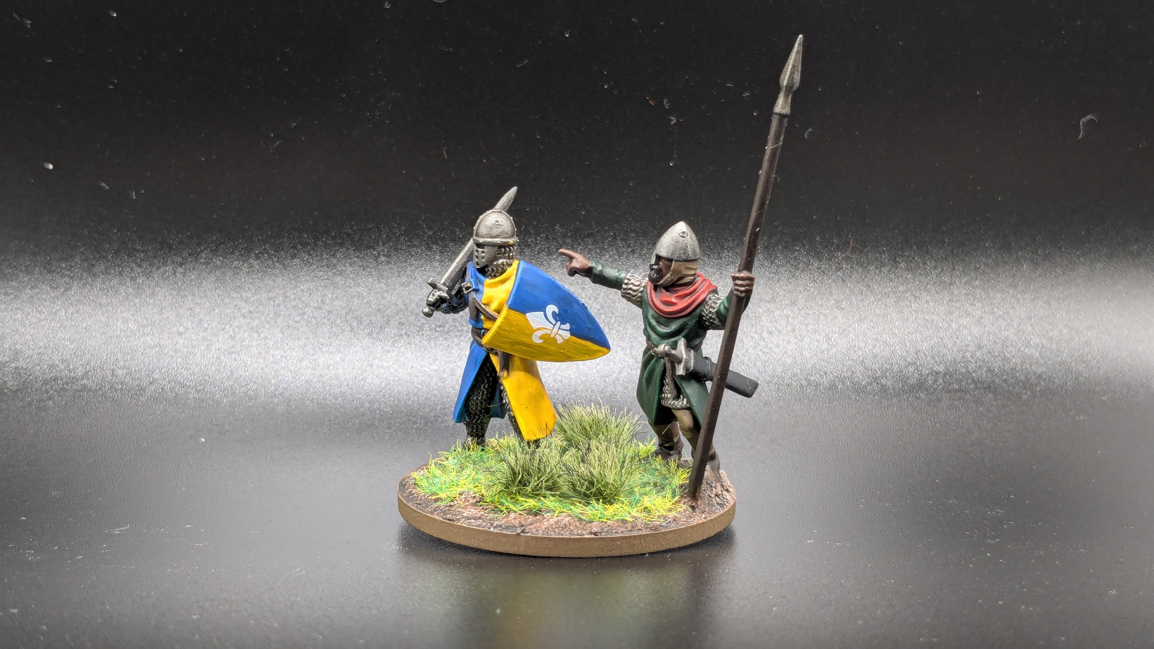 I’ve been continuing my foray into the world of historicals by putting together some knights. I picked up the Barons’ War Second Edition starter box (the deluxe edition that comes with mounted knights and serjeants) from Wargames Atlantic earlier this year, and I’ve slowly been churning out a myriad of feudal weirdos. These heavily armed and armoured jobbers represent a warlord on foot for use in either Barons’ War or SAGA: Age of Chivalry, as well as a unit of knights with great weapons to complement the group with swords and shields that I finished a couple of months ago. One of the things I love about SAGA is the fact that warlords are mounted on a bigger base, allowing you to go all out with creating small dioramas, especially for characters on foot (this is less easy for mounted characters, as the horse usually takes up most of the base). I had a lot of fun with the baron; I added a serjeant to his base to represent a banner bearer/attendant, and gave him a pointing arm to represent the poor chap either giving directions to the clueless noble or alerting him to a charging battleline. I also decided to paint him with a darker skin tone, for no other reason than I wanted to. I’ve been trying to learn how to paint more varied skin tones to represent the world around me better, and I thought this would be a good opportunity to practice those skills. Meanwhile, the transfer on his shield came from the Sisters of Battle transfer sheet. Despite the kits not having a lot in common, I’ve found that a few of the Battle Sister transfers look pretty in keeping with medieval heraldry (to my mind at least), so it was nice to repurpose them before I inevitably cave and pick up some specialist transfers.
