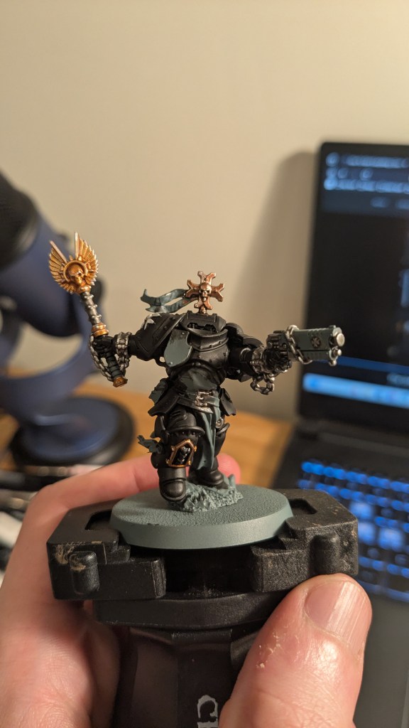 One of the reasons I haven’t been painting my Orlocks is because I’ve been busy painting up a special character model for Warhammer 40,000: a Black Templar’s Execrator. I picked this guy up on a whim while in my local GW one day, and he’s been a real joy to paint. I’m nowhere near finished with him, but I’ve really enjoyed painting this angry weirdo with a really unfortunate name. Black and white are notoriously difficult colours to paint well, but I’ve been following some online tutorials from Goonhammer and elsewhere to get this guy looking good. I’ve also been trying some new techniques (sub-assemblies: what a concept), and it’s been great trying to up my edge highlighting game as well, especially since it’s something I still struggle with despite more than 15 years in the hobby. I don’t know if this marks the start of a new army. I’m tempted to say yes, but I do have to figure out where to put all these models before they breach containment and take over the house. Maybe some more spring cleaning is in order…
