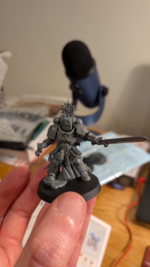 Eventually, however, I recovered enough to kitbash this guy. I had an Emperor’s Champion mini, which came with my Black Templars’ Combat Patrol. Unfortunately, some overzealous spray priming led to it being more or less unusable until I strip it, so I decided to kitbash a new one. I doubt there is going to be any world where I have to use two champions in one list, but it allowed me to put my own spin on the model. I find that, for whatever reason, a lot of the Black Templar character models seem to be posed a bit awkwardly: the Marshal model looks like he has thrown his back out, and the Emperor’s Champion does look a little bit like he’s falling over. So, kitbashing a new one felt like a good challenge. I took inspiration from a couple of different conversions I saw online, and combined a Company Heroes box with a Black Templars upgrade sprue and some 3D printed bits from Archie’s Forge.