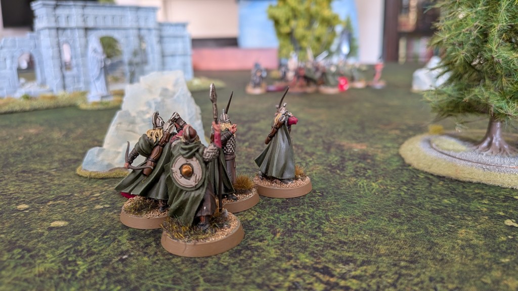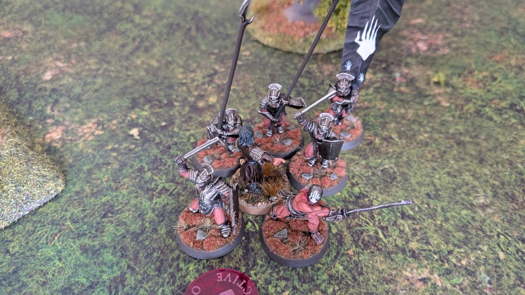 The scenario we were playing was Domination, with a central objective as well as four further objectives spread across the table. I gained priority to decide who went first, deciding it would be best if Ben took the lead as it was my first time playing MESBG. It didn’t take long for a large scrum to break out in the centre of the board, one that eventually claimed the lives of Theoden and a bunch of Warriors of Rohan. Aragorn managed to do quite well and kill some Uruk-hai, but, due to me failing some key will rolls, he spent the majority of the game transfixed by Saruman and unable to do anything. Meanwhile, I ended up underutilising my archers, leaving them to guard a back field objective, so they ended up not doing a lot. Coming from a background of playing Warhammer 40,000 and The Horus Heresy, I had thought that shooting was going to be a bit more lethal than it actually was, so it was surprising to see arrows just bounce off the Uruk-Hai.